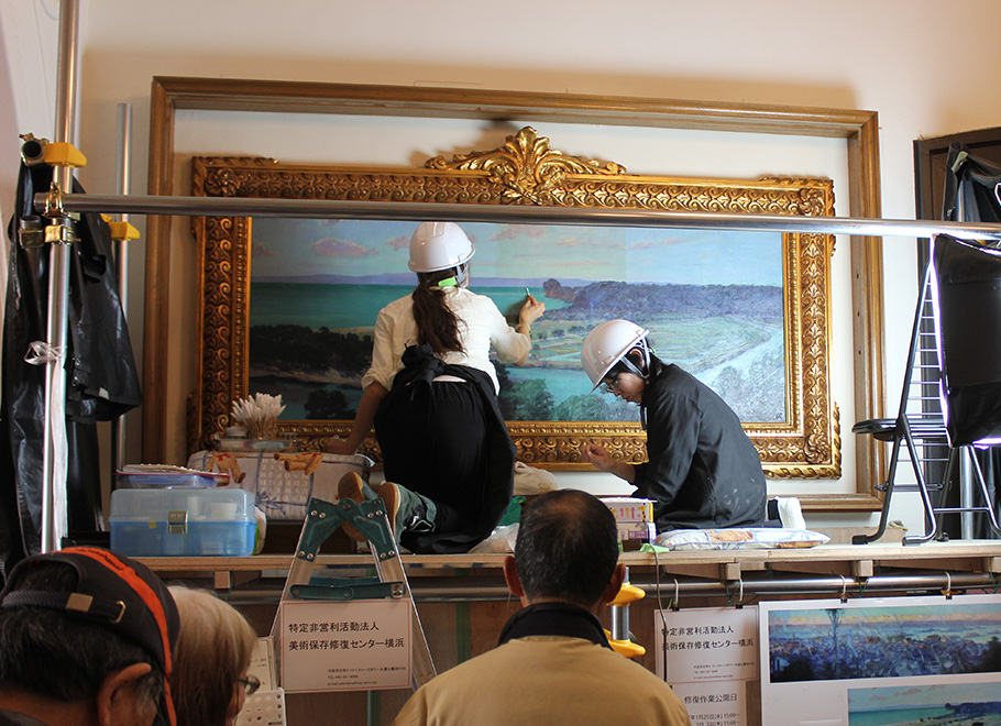 「開港記念会館に飾られていた2枚の絵画は、壁に取り付けられた額縁のようなボックスの中に入っていました。絵自体はキャンバスに描かれた油彩画だったのですが、壁に貼り付けられた壁画だったことが開けてみて初めてわかった。そうなると取り外しての修復が出来ないので、展示されている場所に足場を組んで作業をすることになる。大変な作業になりましたが、途中で一般のお客さんにも公開して修復の工程を見てもらったり、修復についての話をする機会も設けさせてもらうことができたりしたのは良かったですね」