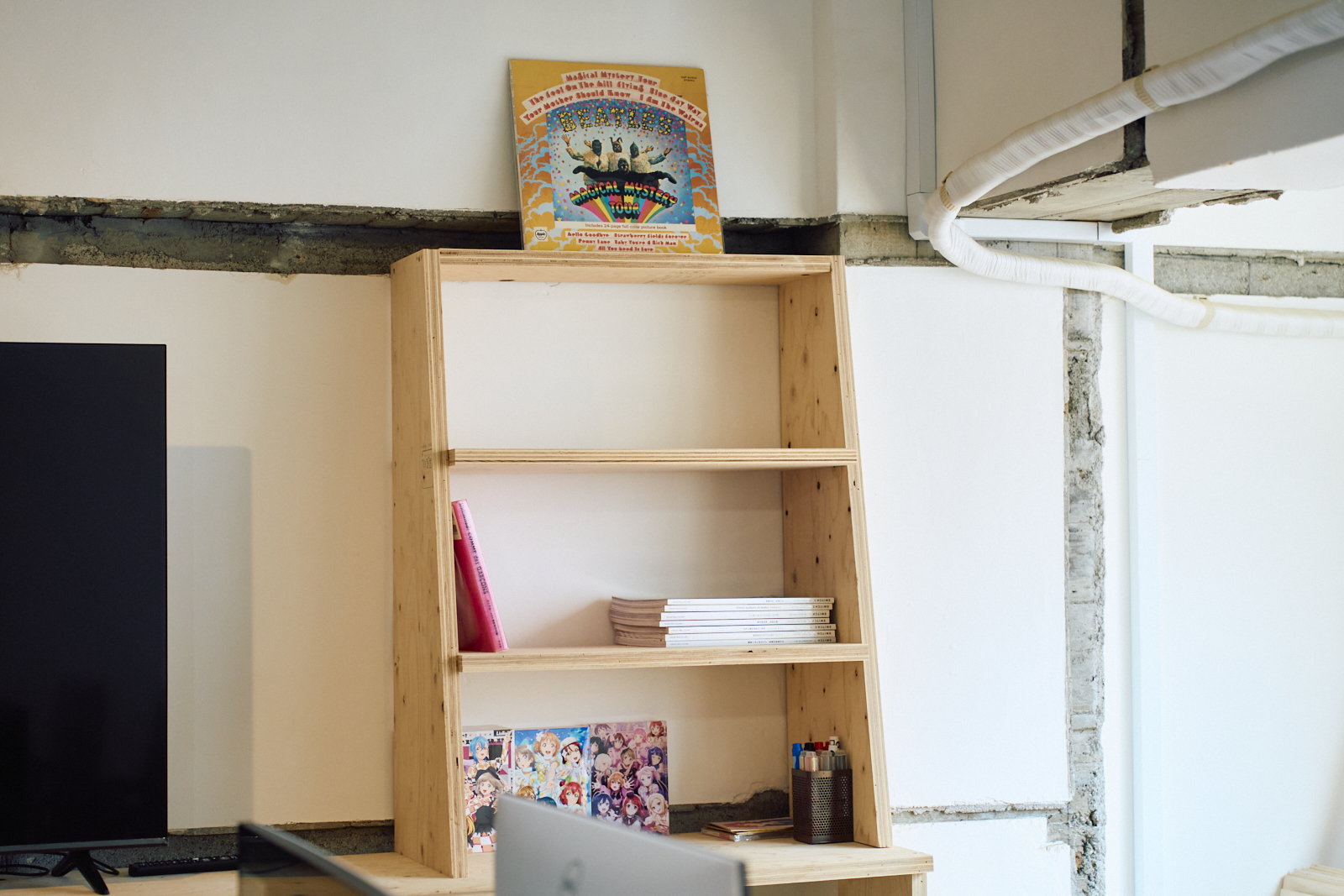 この棚も手づくり。下段にふたりが好きなアニメのグッズ、中段に石川さんが好きだというファッションデザイナーが特集された雑誌、上段に会社ロゴの参考にしたというレコードジャケットが置かれている