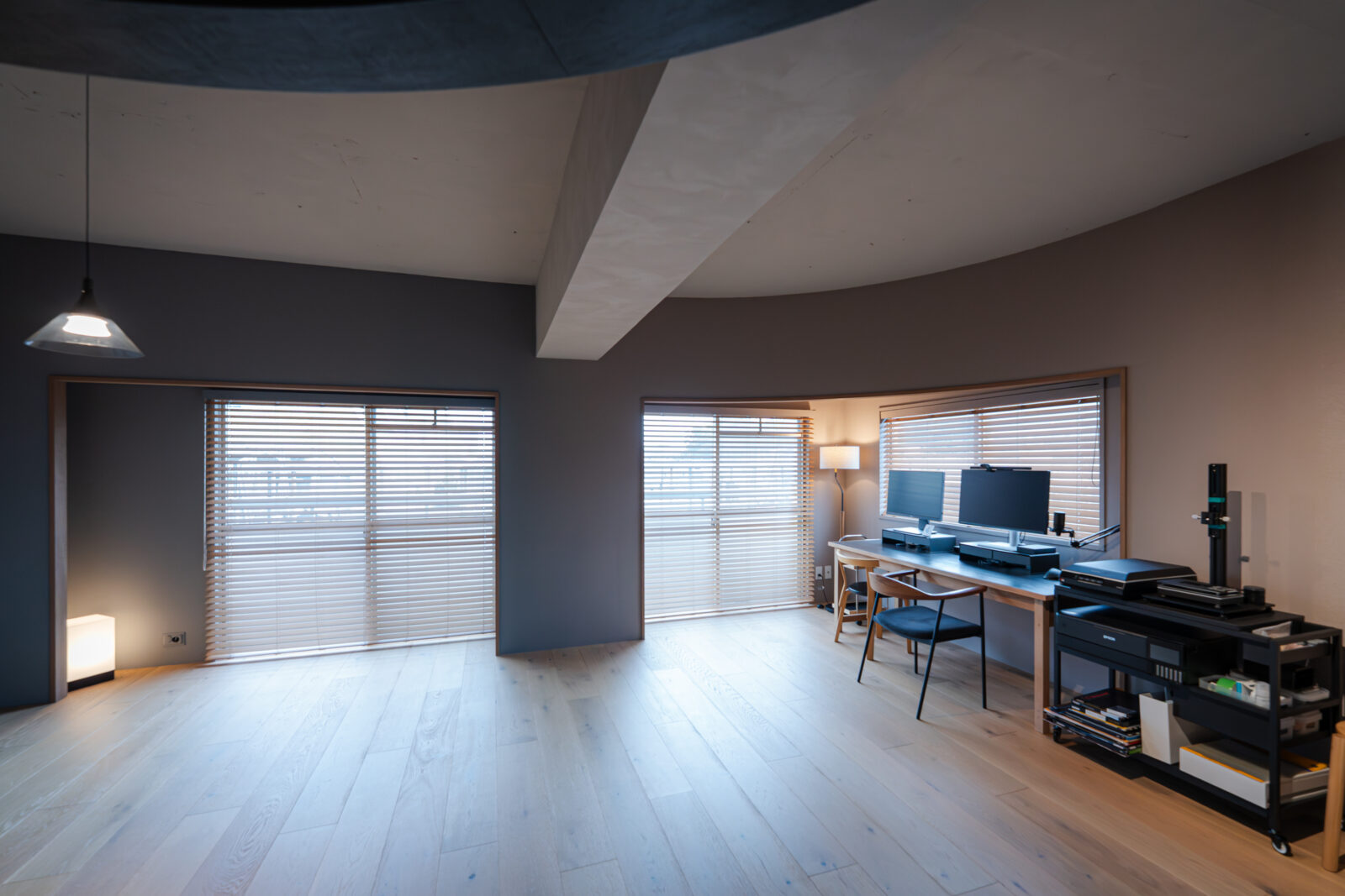 スタジオ内を左右によく見回すと、壁は青みのあるグレーからオフホワイトまでグラデーションするように塗装されている。スタジオは主に作業スペース、写真集が並ぶライブラリースペース、暗室作業スペースの3つに分かれているが、曲線的なアール壁がスペースごとの境界を感じさせないようになっている。