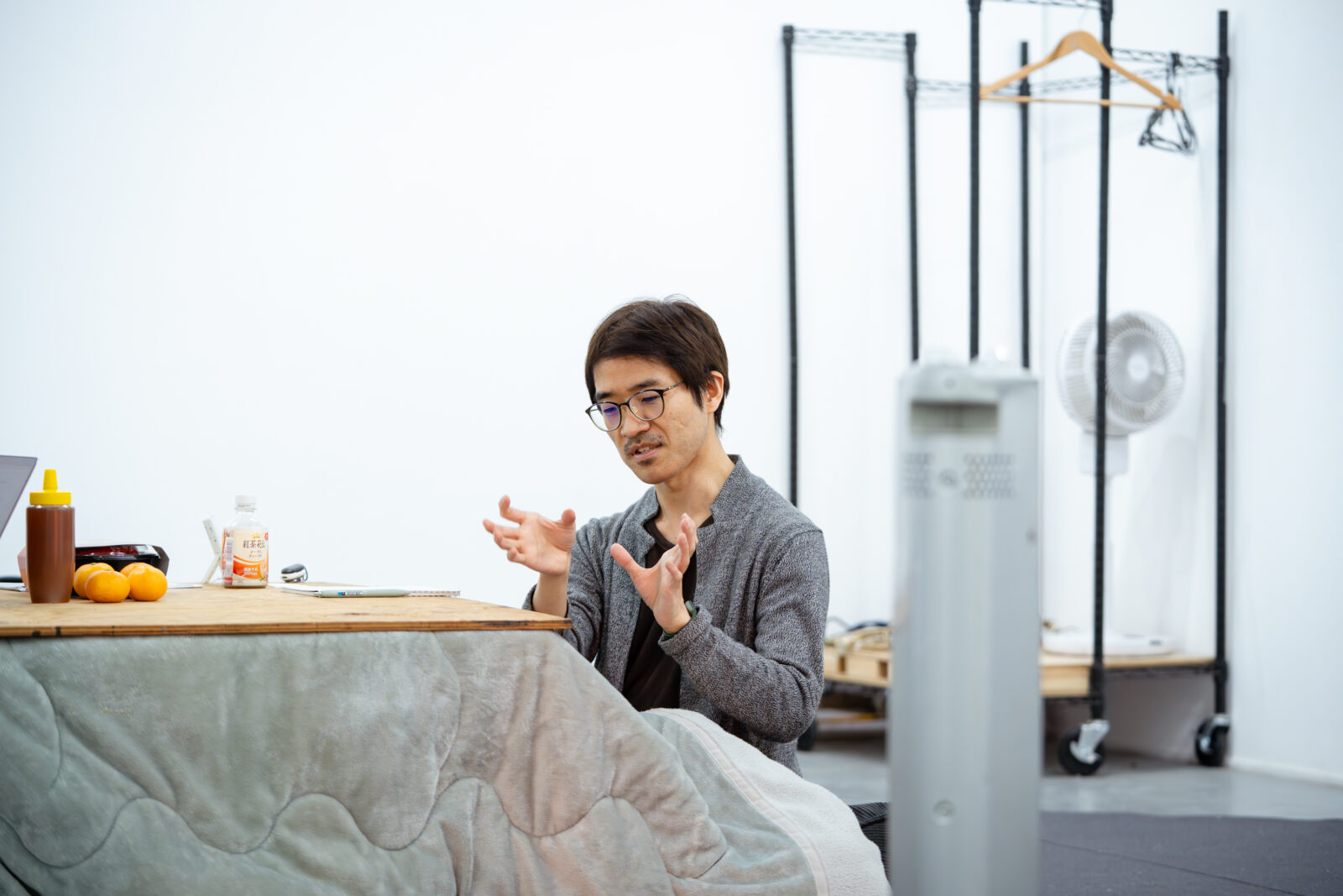 今しゃべっていることのほとんどは意味に還元されると思います。ですが、目線を外しているとか木目とか、このコタツの熱さとか、このスタジオに音が反響する感じとか、意味じゃないところも明らかに対話に影響を与えている。その流出をどれくらい防いで保存するかということをやりたいと思っています。