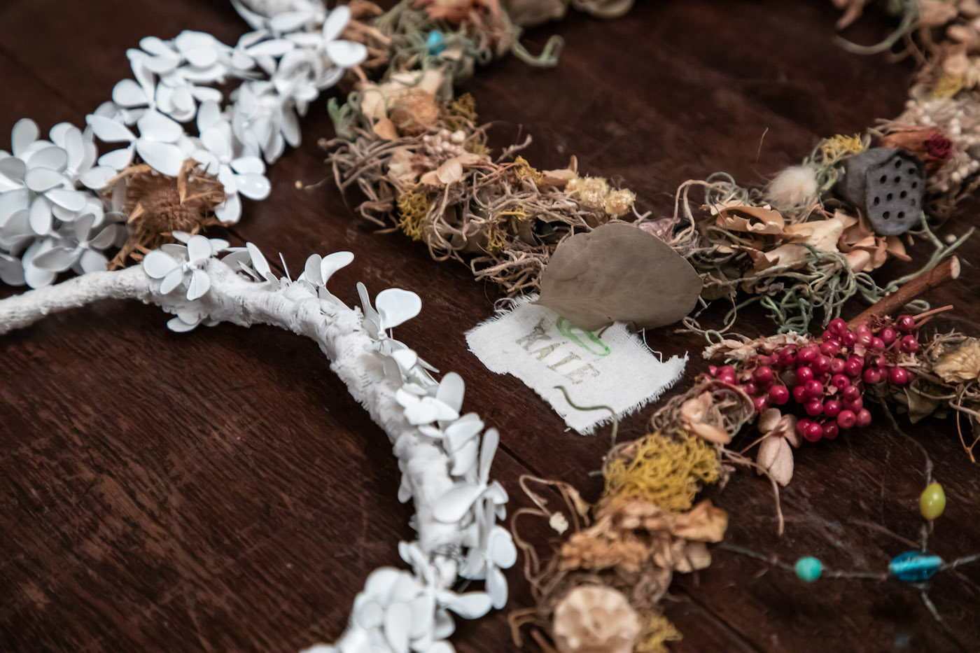 tenjishitsu:Tür aus Holz 常磐町での夏至祭に西澤力(BALANCE FLOWER SHOP)さんが提供した花かんむり