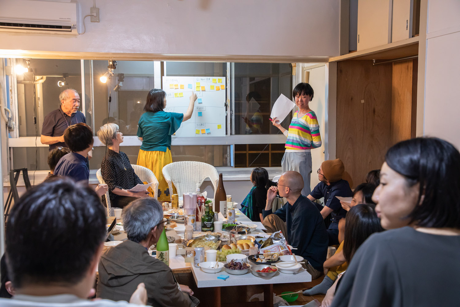 関内外OPEN!をきっかけとした催しではあるものの、屋上パーティはあえて公開プログラムにせず、既存住民にもお声がけしてビル内での交流の場にしようと実施した。ポートレートプロジェクトには4部屋の既存住民の参加があったものの、パーティの方は土曜日夜の開催ということもあり、参加はかなわなかった。だがパーティの途中で、トキワビル2階に入居する雀荘のおかみさんが、営業中のお店をすこしだけ留守にして屋上の様子をのぞきに来てくれたのである。一緒に飲み食いをするには至らなかったが、交流の一歩をみんなで喜んだ。
