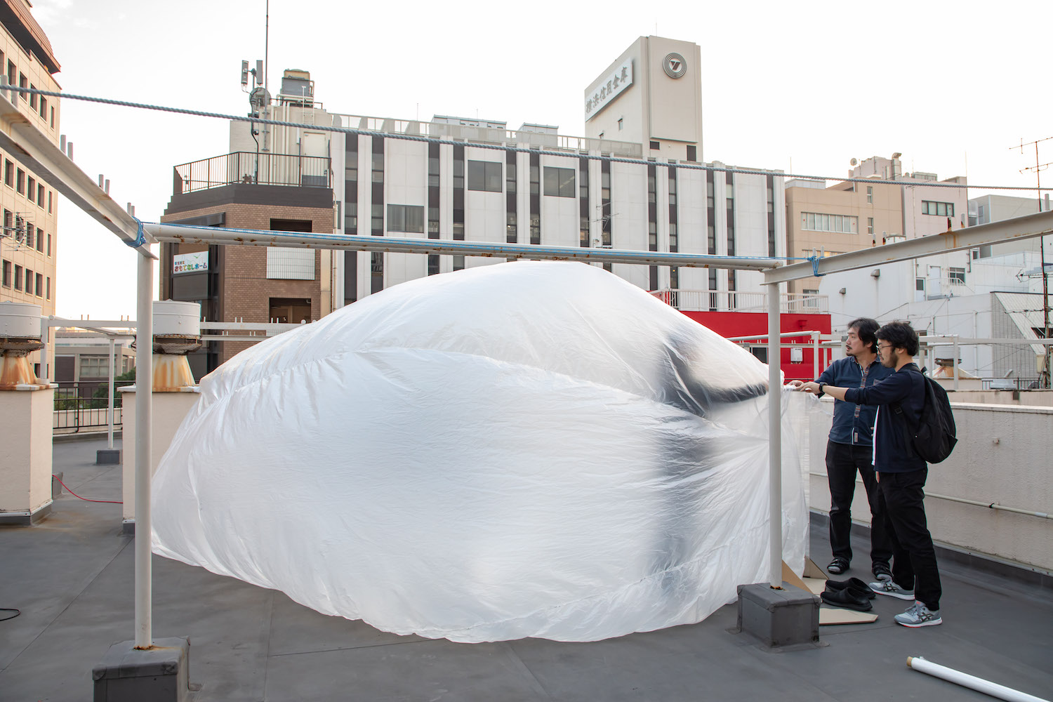 311号室のインフォメーションセンターと、屋上でのシークレットパーティで使用した大きなバルーンは、建築家の浅沼秀治さん(アトリエ・モビル)のアイデアでつくった昨年の「常盤ノブ」をアップデートしたものだ。一回り大きなサイズのバルーンを、今年も入居者によるワークショップで制作した。大きなサイズのバルーンをつくるのに時間がかかると思われたが、昨年度の経験値が生かされワークショップはスムーズに進行。なんと予定のスケジュールを1日まいて完成することができた。経験が蓄積されていることも実感でき「形を変えて同じバルーンをつくっていくのも面白い」という手ごたえもあった。これからトキワビル/シンコービルの恒例企画として、毎年大きなバルーンがお目見えするかも……?